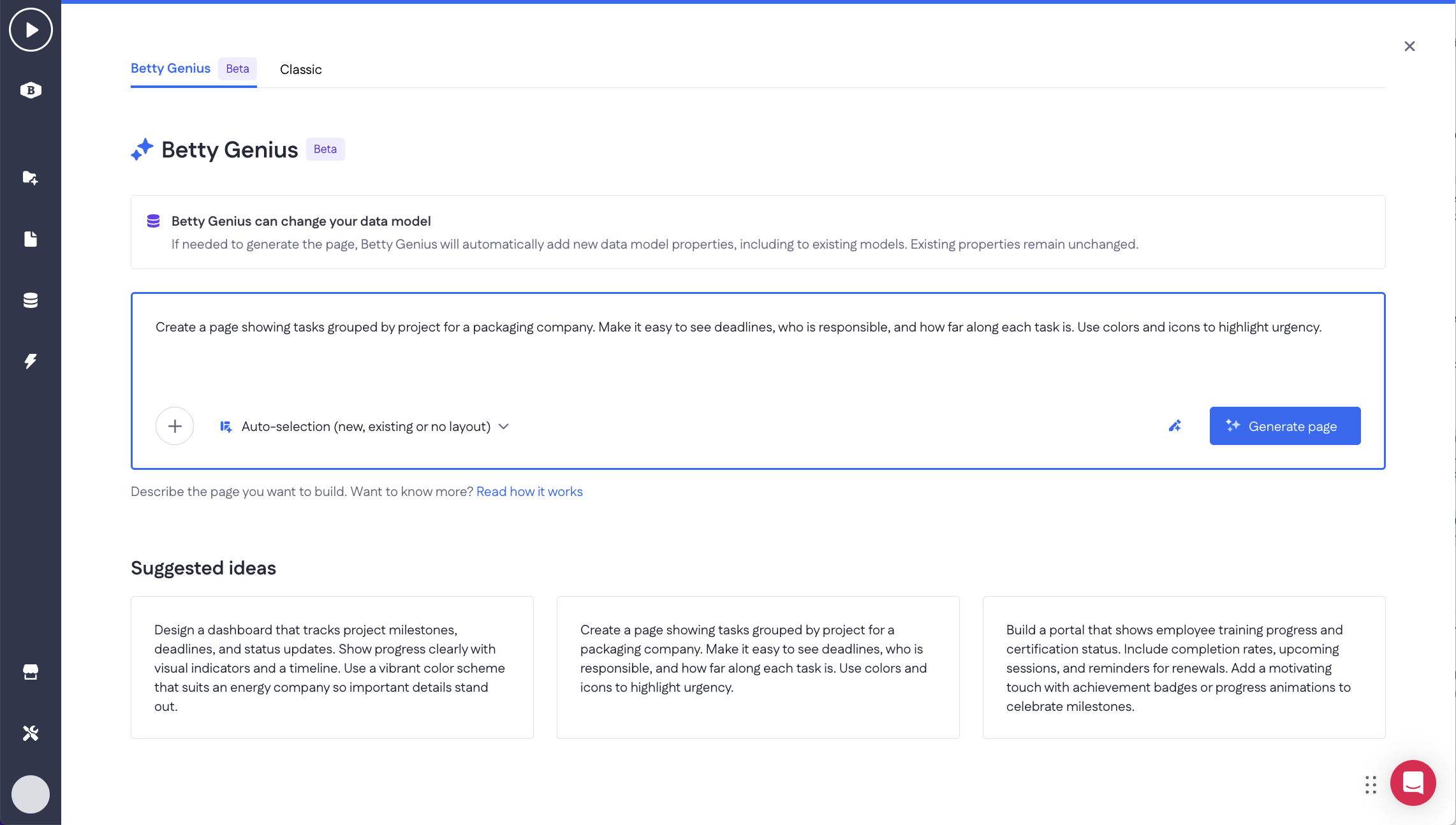 Betty Genius in new page creation: In the new page screen, Betty Genius is now available as an additional way to create pages, making it easier to generate and iterate on new functionality.