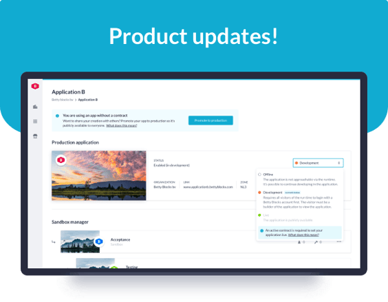 The Betty Blocks platform rolled out a new feature called the Application status. With it, you’ll be able to manage and govern the status of applications and even promote applications from a development to production state to make them publicly...